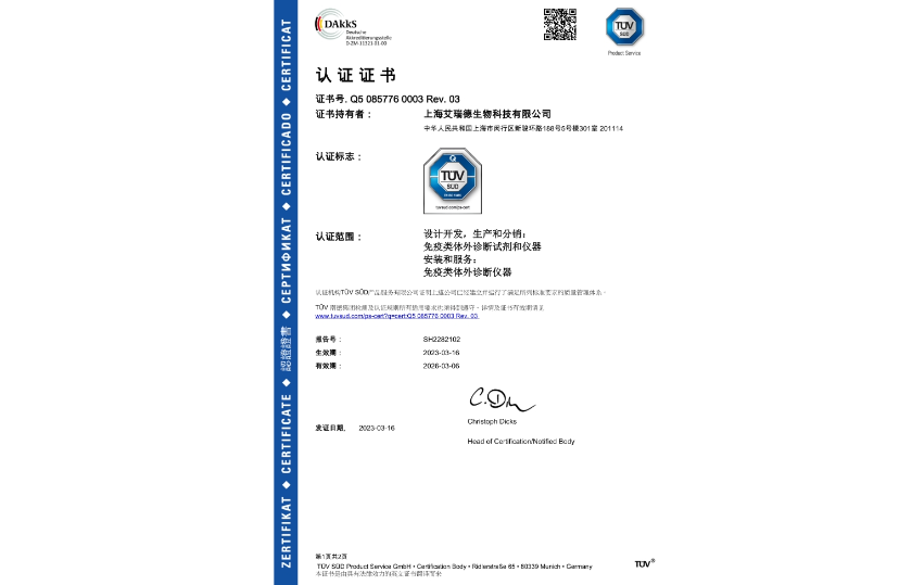 公司集產(chǎn)品研發(fā)、生產(chǎn)、銷(xiāo)售、服務(wù)于一體,采取目前國際一流的技術(shù)標準,始終堅持“質(zhì)量第一,追求卓越,為顧客提供優(yōu)質(zhì)的產(chǎn)品和滿(mǎn)意的服務(wù),使企業(yè)的質(zhì)量體系得到持續改進(jìn)”的方針,產(chǎn)品研發(fā)上以“快速、精確、不占空間”為目標導向,一直致力于膠體金或熒光體外診斷試劑配套的全自動(dòng)干式免疫分析儀的研發(fā)創(chuàng )新。已獲得藥監局頒發(fā)醫療器械生產(chǎn)許可證、日本厚生省生產(chǎn)許可證及ISO13485 TUV質(zhì)量體系認證。