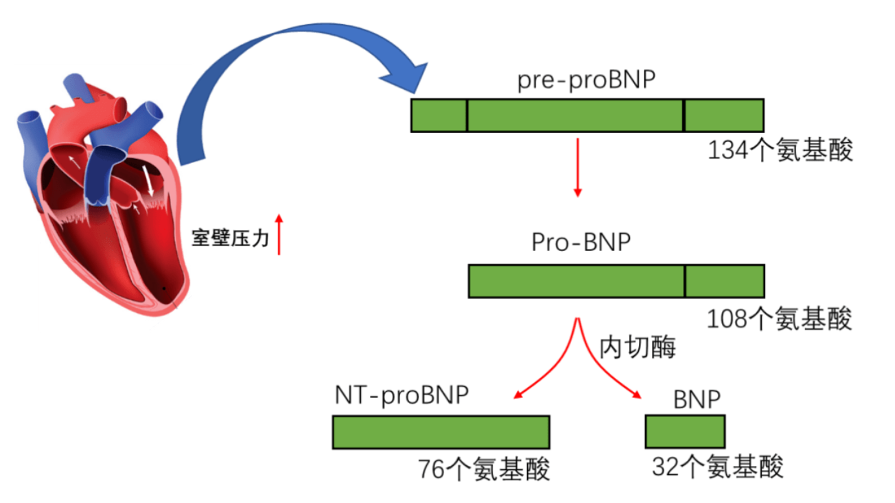 主要由心室肌細胞合成和分泌,在心室負荷過(guò)重或擴張時(shí)增加,因此可用來(lái)反映心室功能改變,是心室障礙的特異敏感指標,編碼人BNP的基因NPPB位于1號染色體1p36.2。當心肌細胞收到牽拉刺激后,首先分泌pre-proBNP,隨后信號肽被移除形成了proBNP,是由108 個(gè)氨基酸組成的前體形式。proBNP在內切酶的作用下裂解為有生物活性的BNP(1-32aa)和生物活性未知的NT-proBNP(1-76aa),并釋放入血液循環(huán)。